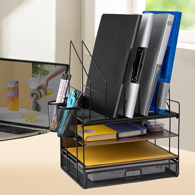 - 【SPACE SAVING】- This desktop organizer is composed of 4 stackable letter trays+5 vertical classifiers+2 pen holders.This desk paper organizer is designed to maximize your desk space and help you keep your office supplies organized. it provides ample storage for your papers, letters, files, and other small items, effectively reducing clutter on your desk.