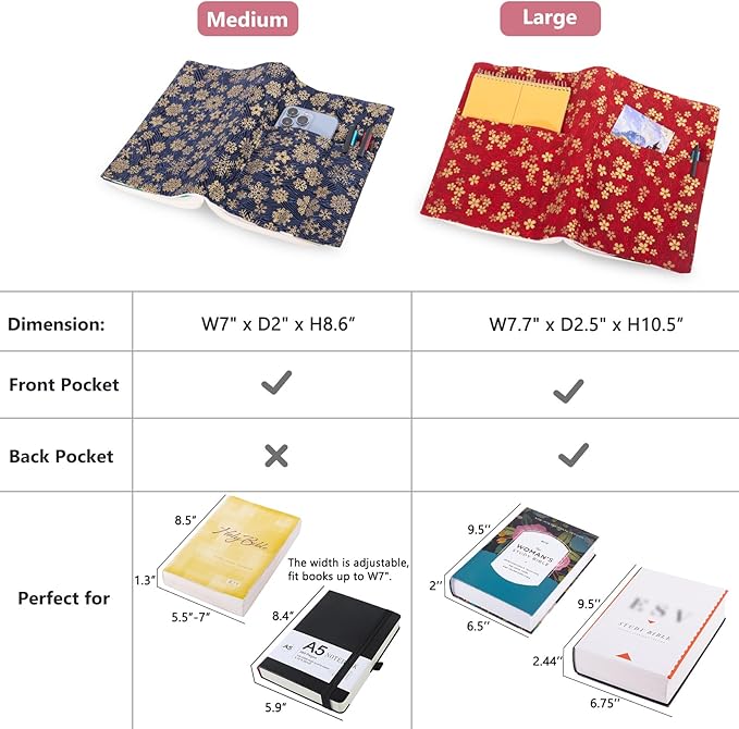 - SIZE - Comes 2 sizes for you to choose from. Medium: W7" X D2" XH10.5" which fits the book in the size of W5.5" X H8.5",AA Big Book (5.5”x8.5”) or 12 Steps & 12 Traditions or A5 Journal notebook; Large: W7.7" X D2.5" XH10.5" which is just for the woman's study bible or ESV bible in size of W6.75"XD2.24" XH9.5". The width of the book cover is adjustable. Please measure your books when ordering.