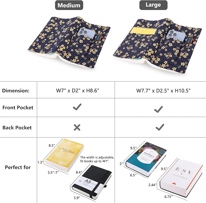 - SIZE - Comes 2 sizes for you to choose from. Medium: W7" X D2" XH10.5" which fits the book in the size of W5.5" X H8.5",AA Big Book (5.5”x8.5”) or 12 Steps & 12 Traditions or A5 Journal notebook; Large: W7.7" X D2.5" XH10.5" which is just for the woman's study bible or ESV bible in size of W6.75"XD2.24" XH9.5". The width of the book cover is adjustable. Please measure your books when ordering.