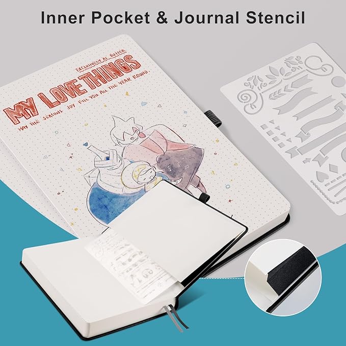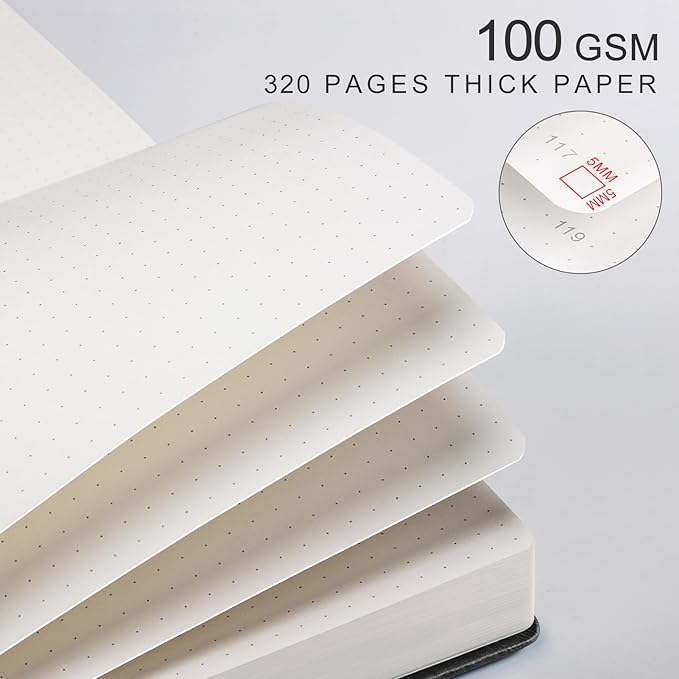 - A5 DOTTED JOURNAL NOTEBOOK: This notebook is a classic A5 size (5.75" x 8.38") with 320 numbered pages, providing you with ample writing space while making it easy to organize notes. 100gsm acid-free light ivory paper, thicker than regular paper, won't cause bleeding, ghosting, or smudging, suitable for most types of pens