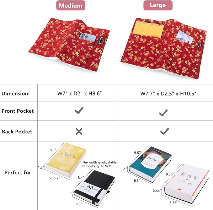 - SIZE - Comes 2 sizes for you to choose from. Medium: W7" X D2" XH10.5" which fits the book in the size of W5.5" X H8.5",AA Big Book (5.5”x8.5”) or 12 Steps & 12 Traditions or A5 Journal notebook; Large: W7.7" X D2.5" XH10.5" which is just for the woman's study bible or ESV bible in size of W6.75"XD2.24" XH9.5". The width of the book cover is adjustable. Please measure your books when ordering.