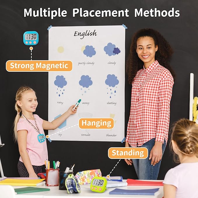 - Classroom timer with Strong Magnetic back 2.0 retractable stand and hook for hanging, can be positioned in variety of locations, like table, blackboard, dry erase board and wall hooks.