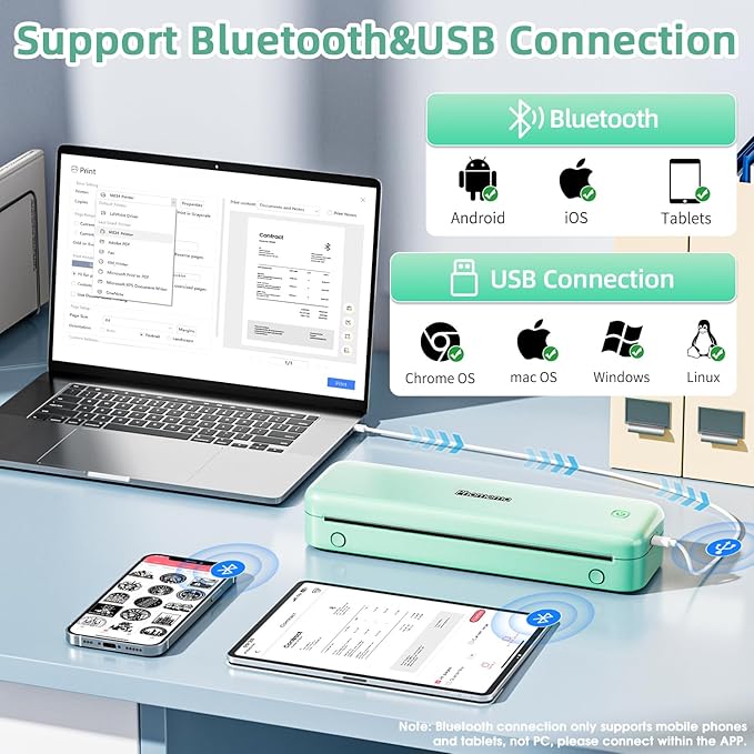 - Phomemo M834 Mobile Printer 【Upgrade 4】High Compatibility: This portable thermal printer is compatible with various devices, including Android and iOS smartphones, tablets, Windows 10/11, Linux, and macOS laptops. Simply connect it to your device via Bluetooth for smartphones or USB for PCs, and you're ready to print. It's that easy and fast! (Note: PC devices only work with USB connection and require driver installation.)