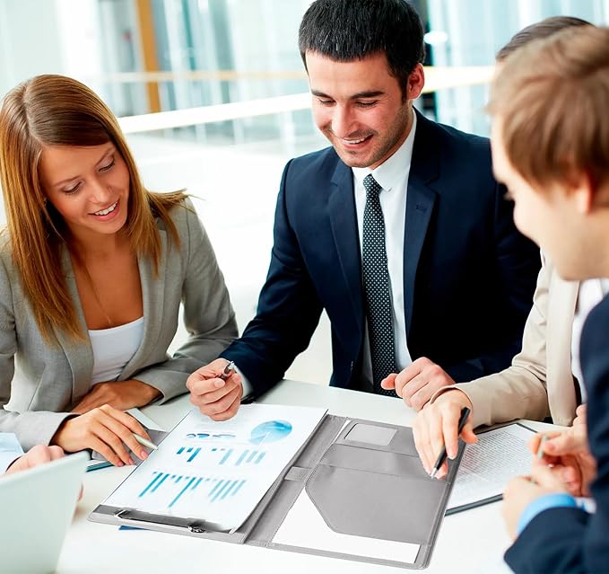 - ✅ Comfortable Leather Folder : This grey clipboard made of high-quality PU leather material,durable classic appearance, filled with sponge, soft feel.Reinforced stitching and buckle closure and 3 magnetic buckle designs make the Portfolio cover more durable.