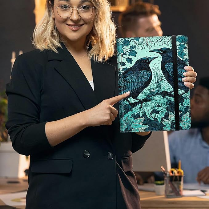 Ravens On Branches Padfolio Folder with Clipboard,Portfolios Organizer Clipboards with Storage Clipboard Writing Pad PU Leather Conference Document Organizer with Business Card Holder