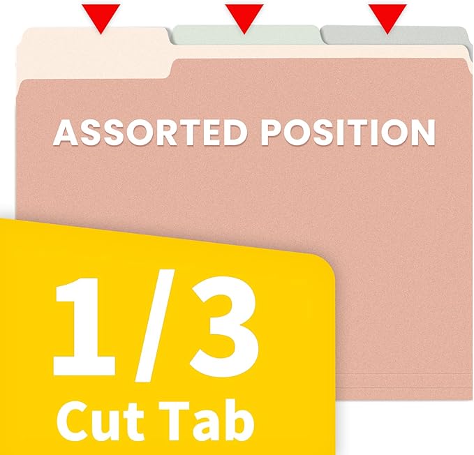 - 1/3 Cut Tab:Navigate your documents with ease using the 1/3 cut file folder labels on these manila folders. This convenient design allows for clear and easy labeling, streamlining the organization and retrieval of your files. Keep your office clutter-free with these colored file folders.