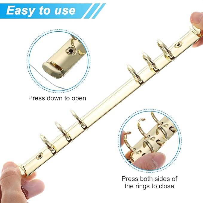 - Instruction: Press both ends to open the rings. Insert papers of appropriate size into the loose leaf binder rings. Then press the both sides of the rings to close them.