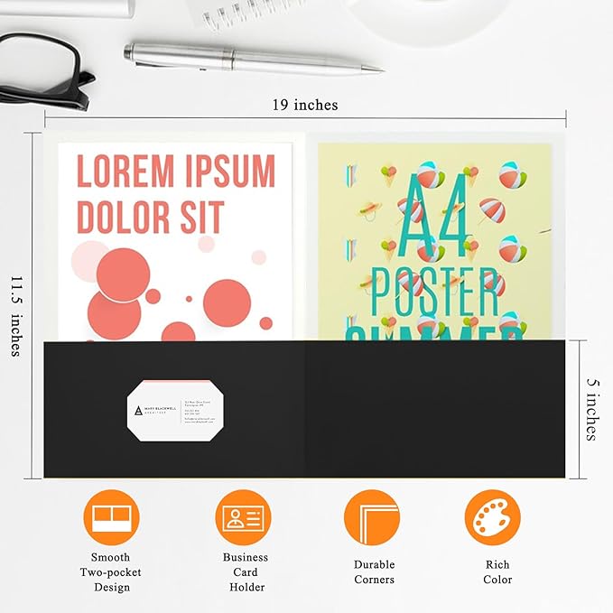 - KEY FEATURES: Two pocket folders with 5" pockets,Each pocket can hold up to 50 sheets,But can even handle more.Four-corner business card holder eliminates popout