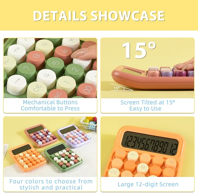 - Mechanical switch computer with lovely large buttons that feel comfortable in your hand and are easy to press accurately.The 12-digit digital display with 15° tilt design provides optimal viewing angle and stability. This basic desktop computer is equipped with the functions of percentage, root sign, and memory recall, which can meet the daily life and basic study and office operations.