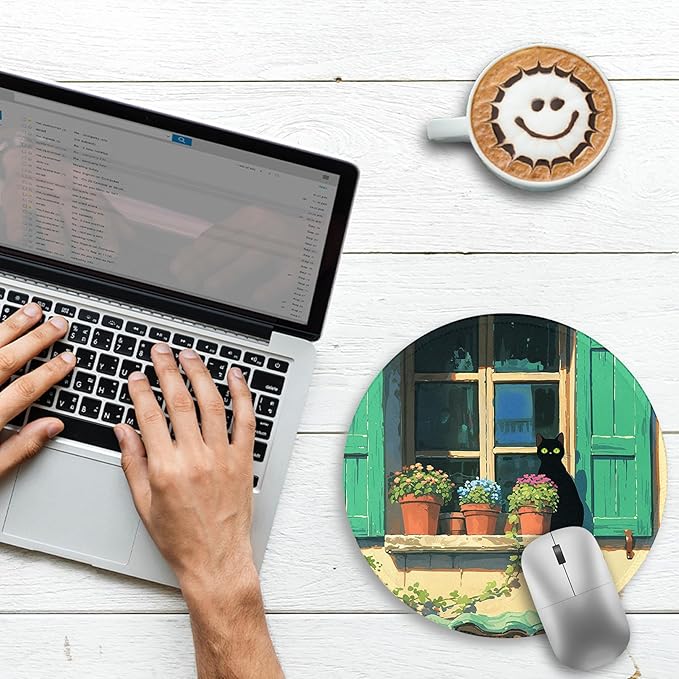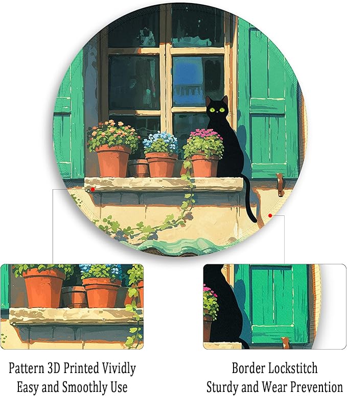 - Adorable Art Design: Enhance your desktop experience with our cute mouse pad, designed in an anime style: a pattern of a black cat crouched by a window with a flower pot. Add color to your everyday desktop and bring a relaxed and good mood