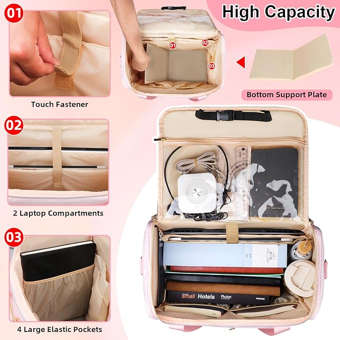 - 【Foldable & Detachable Trolley】The rolling briefcase for women comes with a portable trolley. Its telescopic handle can be adjusted to three different heights (17.1/28/37.4 inches) to meet the needs of people of different heights. The solid base and 2 silent wheels increase safety.