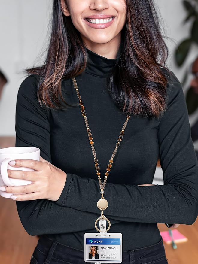 Lanyards for ID Badges and Keys,Natural Stone Beaded Teacher Lanyard for Women,Retractable Lanyard with ID Holder Cute Lanyards for Teachers(Brown)