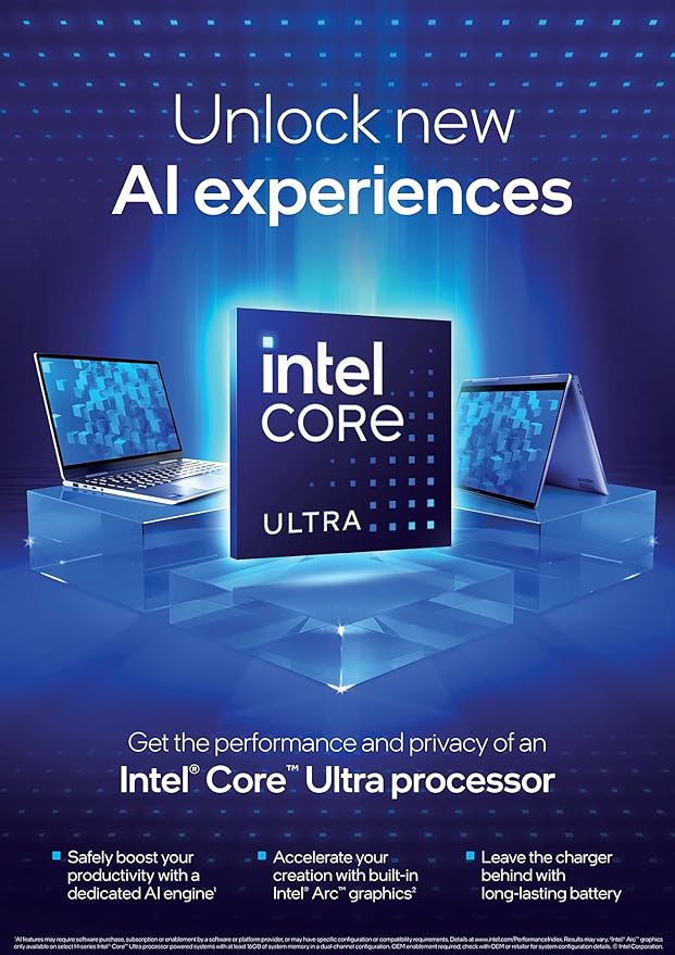 - Unlock New AI experiences: Whether you're working, creating, or playing, get the best of Intel Core Ultra 9 processor 185H in an Intel Evo Edition laptop with a dedicated engine to help unlock AI experiences on the PC, the next level in immersive graphics, and high-performance low power processing, so you can perform for longer while unplugged.