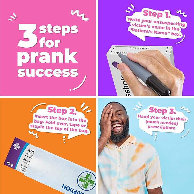 - ANTI-A** : “World’s best pain in the backside remedy”. You probably still can’t believe a prank like this exists! With the hilarious yet convincing packaging coupled with the fake prescription pharmacy bag it comes with is sure to punk and dupe your victim.