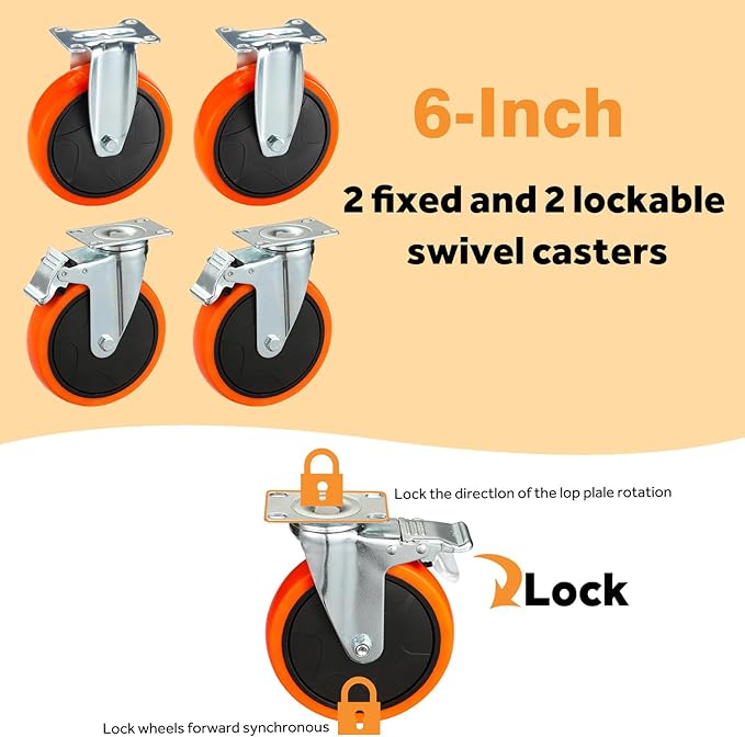 - 🔆 PROFESSIONALLY DESIGNED WHEELS: 2 fixed and 2 swivel 6-inch wheels (2 with Brake) are made of industrial-strength polypropylene and non-marking polyurethane (PU) rubber. The swivel wheels can easily rotate 360 degrees flexibly, and the inner double ball bearings make the rotation and rolling more effortless and labor-saving. The locking mechanism synchronously locks the rotation and the wheel frame, thus achieving effective and fast braking.
