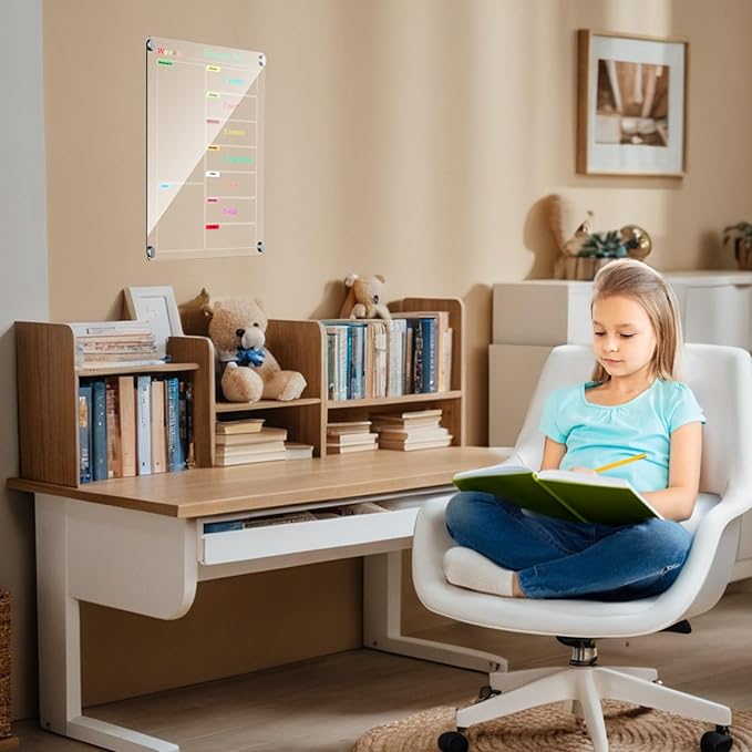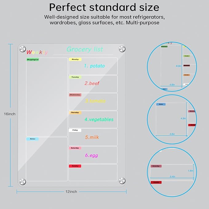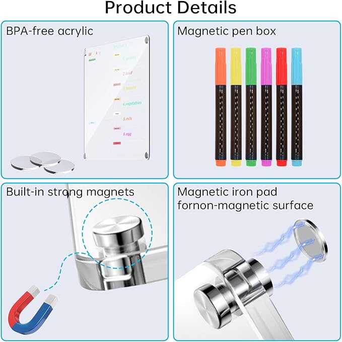 - 【Magnetic Dry Erase Calendar Kit】 Acrylic Weekly and Monthly calendar dry erase plan board kit, includes 6 dry-erase markers,magnetic pen holder, and a cleaning cloth . The calendar board records your daily plan to keep you life and work organized.