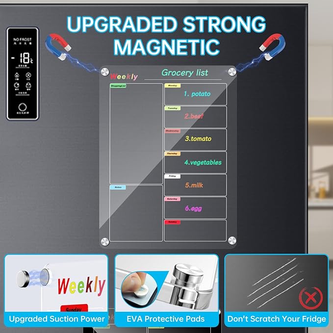 - 【Acrylic Calendar with Strong magnetic Strips】 The acrylic refrigerator calendar board back with dedicated full-wrapped magnetic strips protects the fridge from scratches and damage. Its powerful magnetism ensures a secure grip on the fridge surface and firmly attaches to any flat magnetic surface for versatile uses.