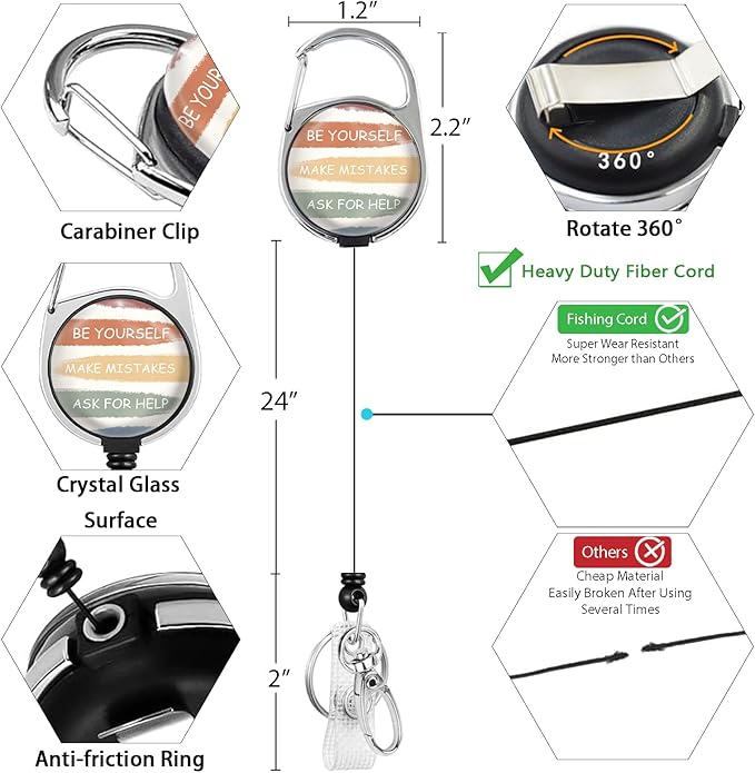 - 360 Degrees Swivel: The retractable badge reel is made of premium plastic and steel, sturdy and light-weight. It is easy to clip on to a belt, backpack, pocket or anywhere you like, with 360 rotating carabiner clip. You can attach your keys, student cards, or ID cards to the key holder easily and conveniently. Great for nurses, doctors, maintenance, office staff, business people, teachers, students, factory workers, drivers, etc