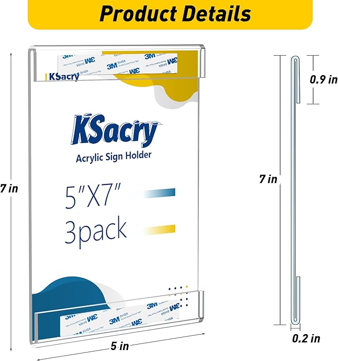 3 Pcs Acrylic Sign Holder 5 x 7, Vertical Wall Mount Sign Holders with 3M Adhesive, Clear Plastic Frames Paper Display Sign Holders for Office, Home, Store, Restaurant - No Drilling