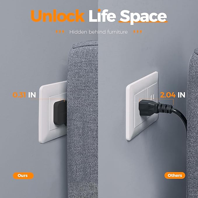- Flat Plug Power Strip 5FT: With only 0.31 in ultra thin flat head design, extension cord flat wall plug can easily fit in tight spots and hide behind bed, sofa, nightstand or other furniture, sitting flush against the wall; 45 degrees right angle design creates an extra space for other plug below without blocking