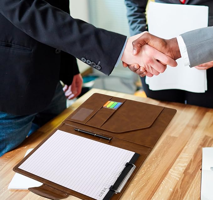 - Versatile Clipfolio with Storage - Leather planner binder includes a briefcase,A4 notebook,arrow shaped sticky notes,and a pen put in the holder.Whether you're an office worker, business owner, or a frequent business negotiator, Our leather binder portfolio make a confident impression in meetings, presentations, or interviews with this.