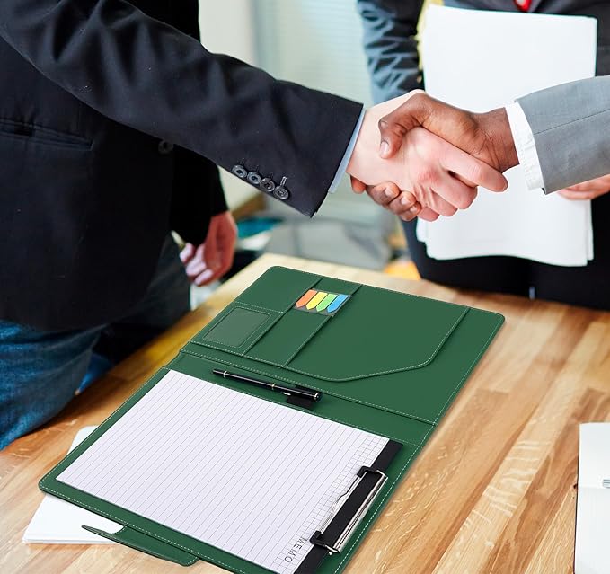 - A4 Portfolio Holder's Material - This professional padfolio folder made of high-quality PU leather material with a green stitching design that exudes elegance,make the Portfolio more durable and easy to clean, odorless, waterproof.Notepad portfolio with three magnetic buckle designs to helps you maintain orderliness and professionalism in various usage scenarios.