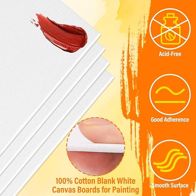 - 8x10 Inch Canvas for Painting: 8x10 canvas boards are made from 100% cotton acid-free and sturdy MDF boards, have a nice surface texture and hold the paint without absorbing it. stays vibrant colors through the years. Suitable for all different types of paints like acrylic, oil, tempera, watercolor and framing