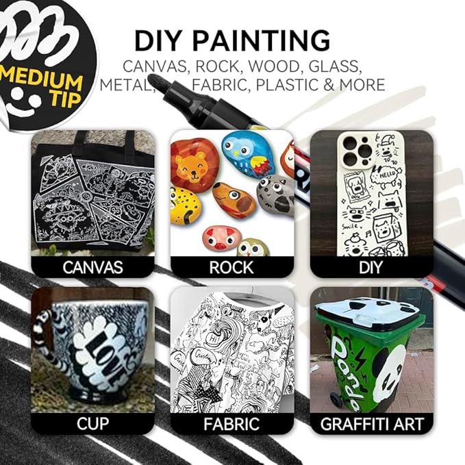 TRANSON Black and White Paint Markers for Fabric Rock Craft Diy Painting Medium Tip Oil Based Waterproof
