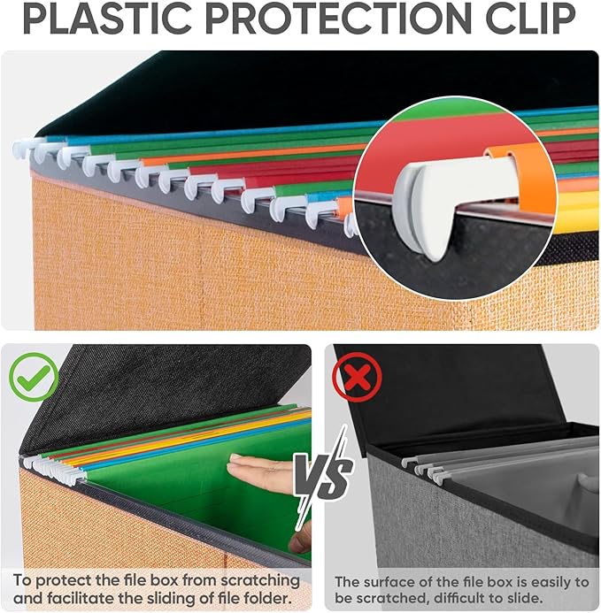 - [UNIVERSAL SIZE] Our file box with lid fits both letter and legal size files. It is designed for efficiency and functionality, with its smooth PVC slide rails on both sides, you can effortlessly slide file folders for easy access and neatly arranged. The lid can fit snugly on the box after hanging folders. (NOTE: file folders are not included)