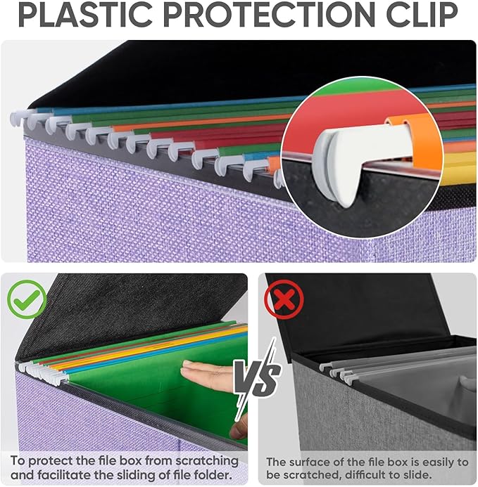 - [UNIVERSAL SIZE] Our file box with lid fits both letter and legal size files. It is designed for efficiency and functionality, with its smooth PVC slide rails on both sides, you can effortlessly slide file folders for easy access and neatly arranged. The lid can fit snugly on the box after hanging folders. (NOTE: file folders are not included)