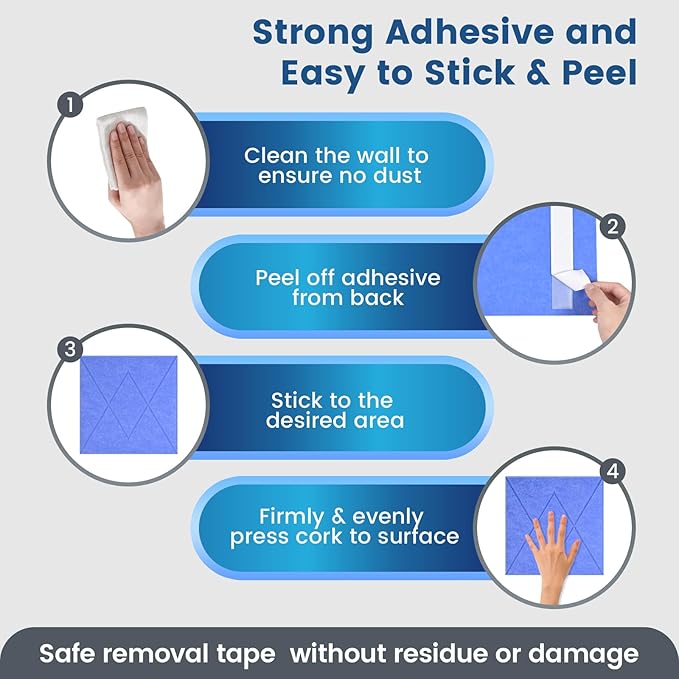 - 【Strong Adhesive & Easy to Stick and Peel】:Equipped with special adhesive tape, our cork boards stick securely to your wall and can be peeled off safely without leaving any residue or causing damage. The adhesive tape is separable from the corkboard, enabling you to remove and reinstall the panels as needed, even after cleaning.