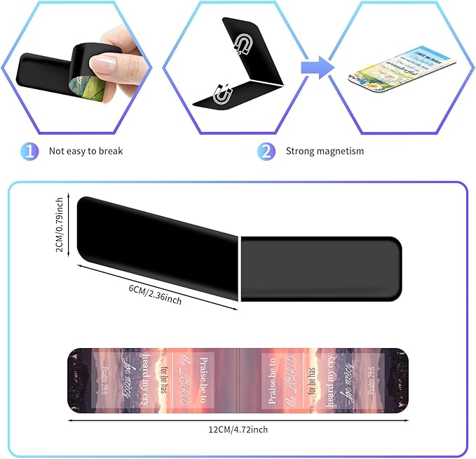- 【Suitable size and easy to carry】Each magnet bookmark is about 2.28in long, 0.74in wide, and about 4.25in unfolded. It has a rounded corner design for easy use. Can place religious bookmarks anywhere on the page of the book and the bookmarks bulk will stay in place. It comes with a transparent storage box for easy carrying and storage