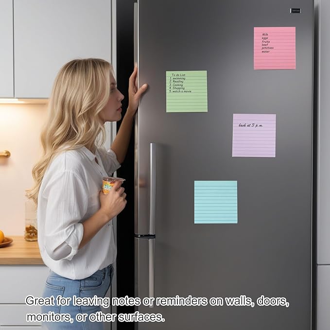 - Widely Using: From office, school and even chores, 4x4 lines sticky notes are helping you stay organized and improved productivity. Sticky notes 4x4 adheres for leaving notes or reminders on walls, doors, fridge, desktops, blackboards, notebook