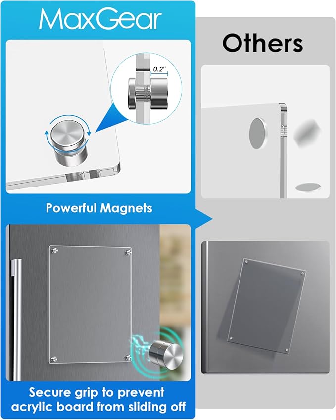 - Anti-sliding/scratch & Powerful Magnetic Design: Four Powerful magnets keep the acrylic dry erase board secure without scratching your fridge, even during opening and closing.(Note: this fridge whiteboard is not suitable for non-magnetic stainless steel fridges or curved fridges/refrigerators.)