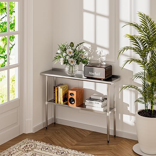 - Space-Savvy Narrow Table: Measuring 14x48x34 inches (LxWxH), with a 14-inch slim tabletop, the stainless steel table is designed to utilize those overlooked nooks and tight corners, Adjust the undershelf freely to fit your storage needs
