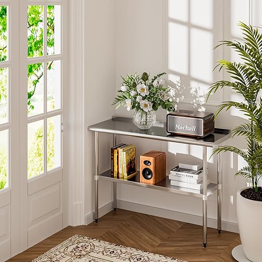 - Space-Savvy Narrow Table: Measuring 18x48x34 inches (LxWxH), with a 18-inch slim tabletop, the stainless steel table is designed to utilize those overlooked nooks and tight corners, Adjust the undershelf freely to fit your storage needs