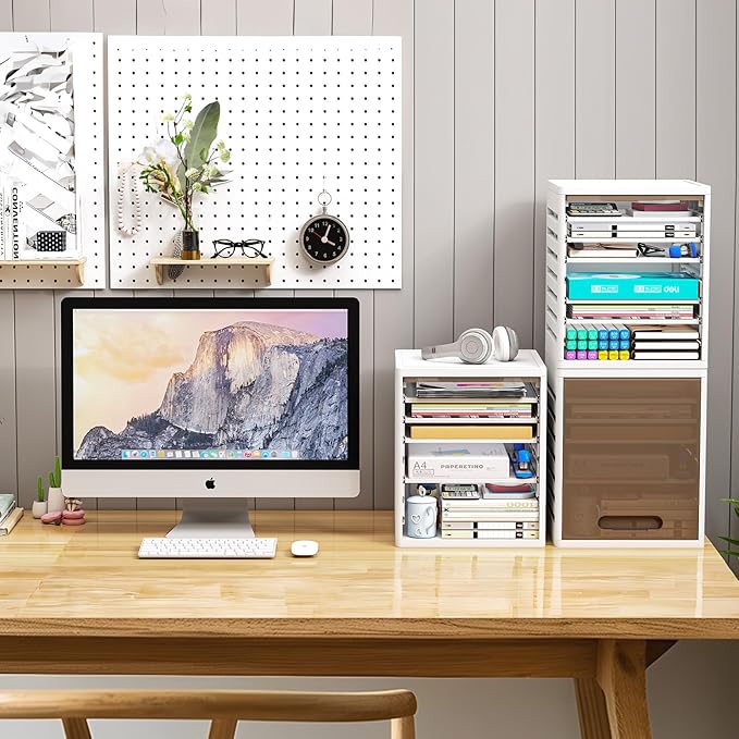 - - Efficiently organize your documents with 7 code Desk Paper Organizer with Door, a desktop file/letter organizer made of durable plastic with drawers for office, home, or school use.