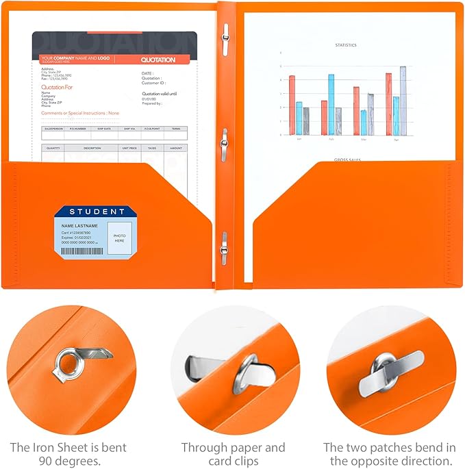 - Vibrant 7-pack Plastic Folders with Pockets and Prongs! Organize your documents in style with seven different colors: Red, Orange, Yellow, Light Green, Light Blue, Dark Blue, and Purple. Easily sort and distinguish your papers