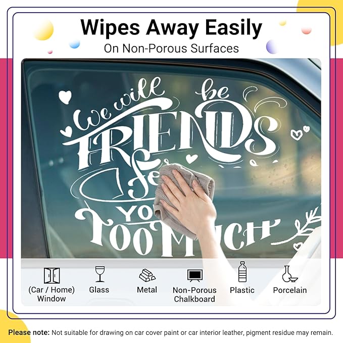 - 【Car Chalk Window Markers Washable】 Simplify your creative process with our washable car chalk window markers. Just a damp cloth effortlessly removes your artwork without dust or residue. Perfect for dynamic environments like restaurants or events where quick updates to menu boards or décor are essential, maintaining pristine surfaces with ease