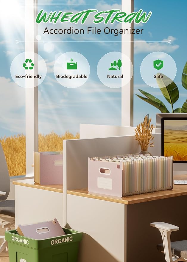- 【Wheat Straw Material】Ecostash's Wheat Straw Open Top Accordion File Organizer are BPA-free, making them safer and healthier compared to plastic and paper file folders. Unlike plastic and paper hanging folders, wheat straw material is sourced from renewable agricultural waste, reducing dependence on petrochemical plastics and forest logging. This helps reduce greenhouse gas emissions, making a collective contribution to protecting the Earth's ecology.