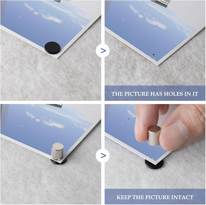 • 【Easy to Use】You just push the pins into the wall with your hands, next position your photo, poster etc. that you want to hang, then hang your item by attaching the magnet to the outside