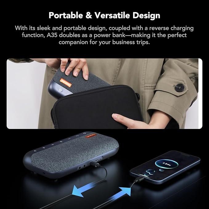 - 32kHZ Omnidirectional Mic & Daisy Chain: Built-in 4 professional-level microphones capture all voices at a 360-degree angle at a higher sampling rate of 32kHZ for a more accurate and natural reproduction of audio and face-to-face audio quality. The conversations are picked up with a strong and natural sound. In addition to individual home office, the speaker mic is ideal for corporate meeting rooms with up to 10 people. By cascading 2 A35 units, conferences with even 20 participants can be supported.