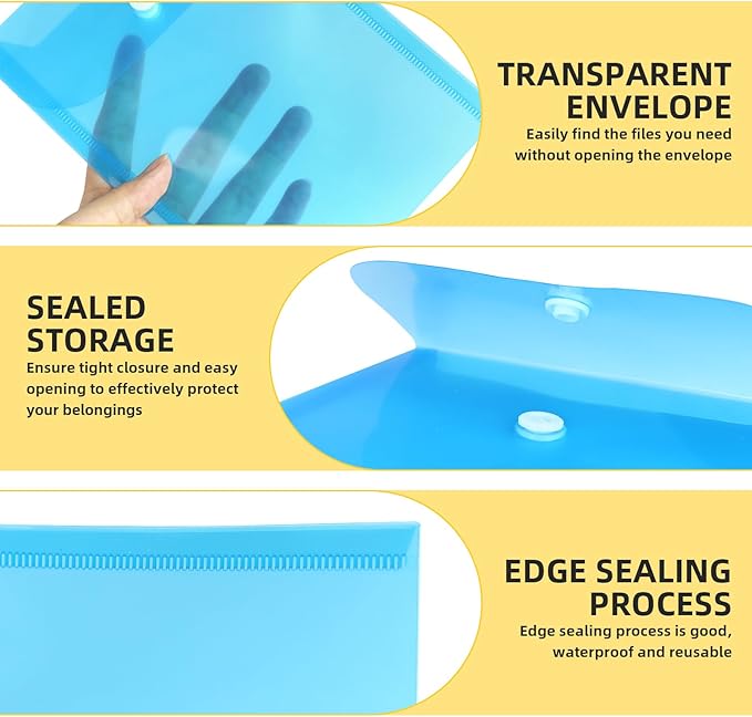 - Premium Quality: The plastic envelopes are made of thickened plastic, with good edge sealing workmanship, waterproof and reusable, and the clear envelopes allow you to directly see the documents inside, so you can easily find the documents you need without opening the envelope