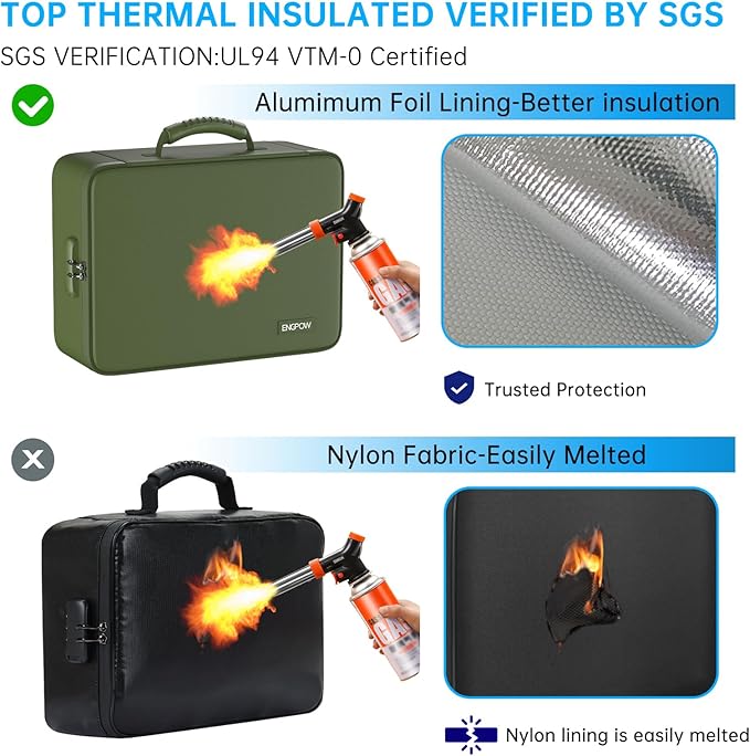 - Fireproof and Water-resistant: The multi-Layer file organizer is made of silicone coated material and aluminum foil which withstand the temperature up to 5200℉(double safe protection).Aluminum foil lining isn’t easily melt under high temperature after several tests. It has been passed by SGS TEST(UL94 VTM-0 Certified).The bag is fireproof and Water-resistant, which can effectively protect your important documents in a fire, flood, and wet weather. They will further keep your files intact