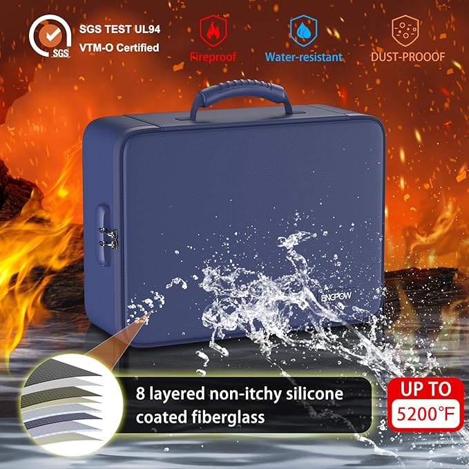 - Fireproof and Water-resistant: The multi-Layer file organizer is made of silicone coated material and aluminum foil which withstand the temperature up to 5200℉(double safe protection).Aluminum foil lining isn’t easily melt under high temperature after several tests. It has been passed by SGS TEST(UL94 VTM-0 Certified).The bag is fireproof and Water-resistant, which can effectively protect your important documents in a fire, flood, and wet weather. They will further keep your files intact