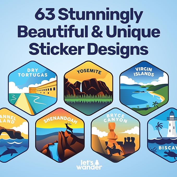 - 63 STUNNINGLY BEAUTIFUL STICKERS: Each sticker is hand designed by Lets Wander for its corresponding National Park, intentionally highlighting the most iconic features of the park.