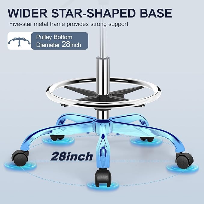 - Humanization Design: 15.8-inch cushion, more suitable for the comfortable size of most people; 28-inch five-star casters drafting chair, less prone to tipping over and more stable. The 2mm thick base supports up to 300 pounds