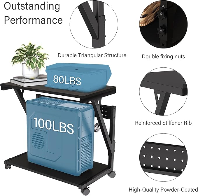 - ๐๐๐ข๐ ๐ก๐ญ ๐๐๐ฃ๐ฎ๐ฌ๐ญ๐๐๐ฅ๐ ๐๐๐ฌ๐ค: The PC tower stand offers a five heights adjustment feature. This CPU cart facilitates storing the atx case tower under or beside the gaming desk and office table, optimizing heat dissipation by increasing the distance between the tower and top shelf.