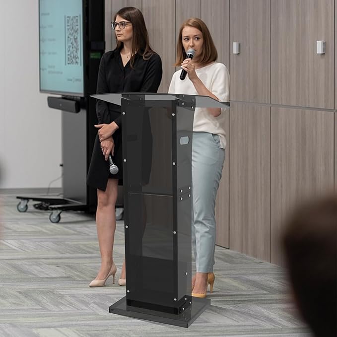 Acrylic Podium Stand with Storage Shelf,Segmented Black Lecterns & Podiums,Pulpits for Churches、Conference、Speeches、Weddings、Classroom、Concert,47" H Professional Presentation Podiums
