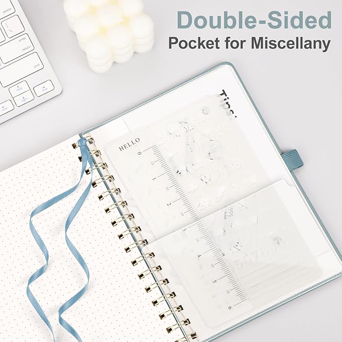 - PRACTICAL LAYOUT: Equipped an elastic band, a pen holder and removable bookmark ruler to keep your notebook organized. Comes with a DIY bookmark with a ribbon for self-attachment to the spiral, serving as a bookmark. Features a double-sided pocket for storing miscellany and 2pcs journal stencil for adding creative to your pages